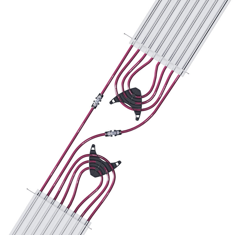 Das System verfügt über asymmetrische Modulhalter, mit denen sich die Deckenmodule einfach und schnell in die Unterkonstruktion einhängen lassen. Das sorgt auch für eine echte Gewerketrennung zwischen Installation und Trockenbau und verkürzt gleichzeitig den Installationsvorgang. Die Montage des Systems mit der Anbindung wird vom Fachgewerk Sanitär, Heizung, Klima (SHK) übernommen. Die vom Gewerk Trockenbau erstellte Metallunterkonstruktion muss nachträglich nicht mehr angepasst werden, denn die Asymmetrie des Modulhalters bietet genügend Spiel, wodurch das Einhängen problemlos möglich ist.